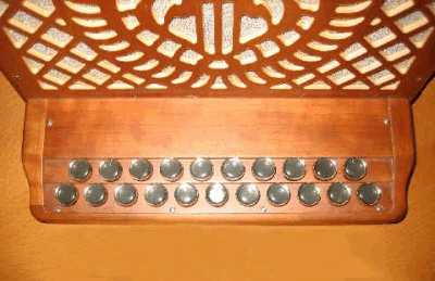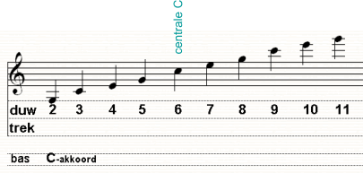 Bekijk de animatie door op de volgende knop te drukken en onthoud de plaats van de noten. De centrale C is de zesde knop van onder- of bovenaf gezien duwend op de buitenrij.