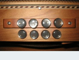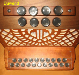 In deel 1 hebben we gezien dat op de buitenrij alle tonen -duwend gespeeld- tot het C-akkoord behoren. Dit zijn dus de tonen C - E- G. Aangezien die combinatie een akkoord vormt, moet dit dus ook aan de baskant gevonden kunnen worden. De twee bastoetsen rechts beneden zijn respectievelijk de C-grondtoon en daarnaast het C-akkoord. Zie de volgende animatie.